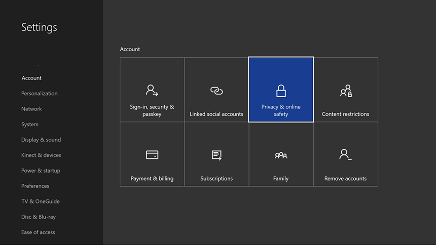 1.Back Xbox home and go “Settngs”. Then select “Account” -> “Privacy & online safety”
