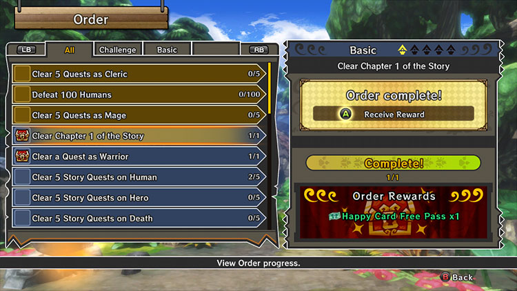 Basic OrdersYou’ll receive Orders such as Complete the quest Chapter 1: Search for the Princess. Fulfill it and the Order will be complete, after which you’ll receive a new Order.