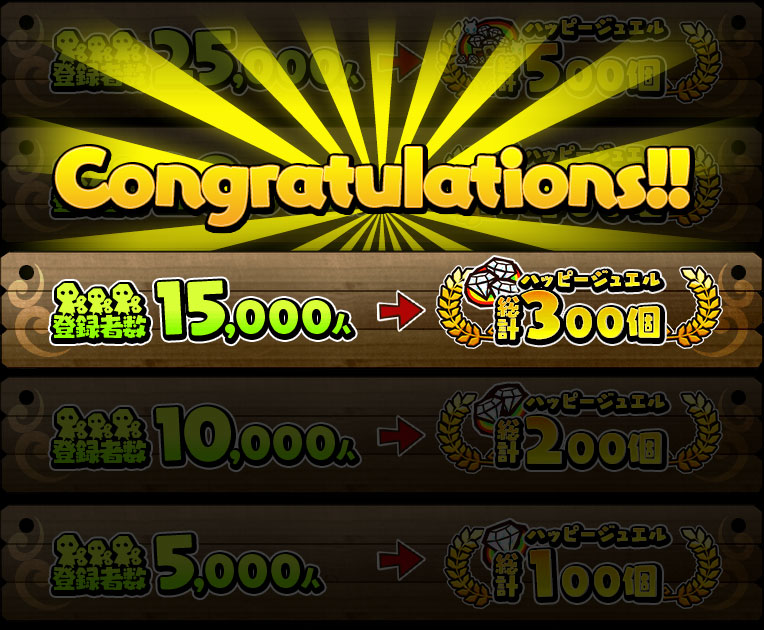 登録者数が25,000人を超えると、最大500個の「ハッピージュエル」がゲーマータグを登録した全員に送られるぞ!