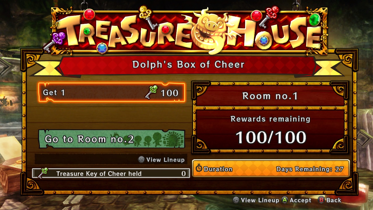 The Treasure House is a place where you can trade Treasure Keys for items. The Treasure House is separated into several rooms, each with a set number of items.
